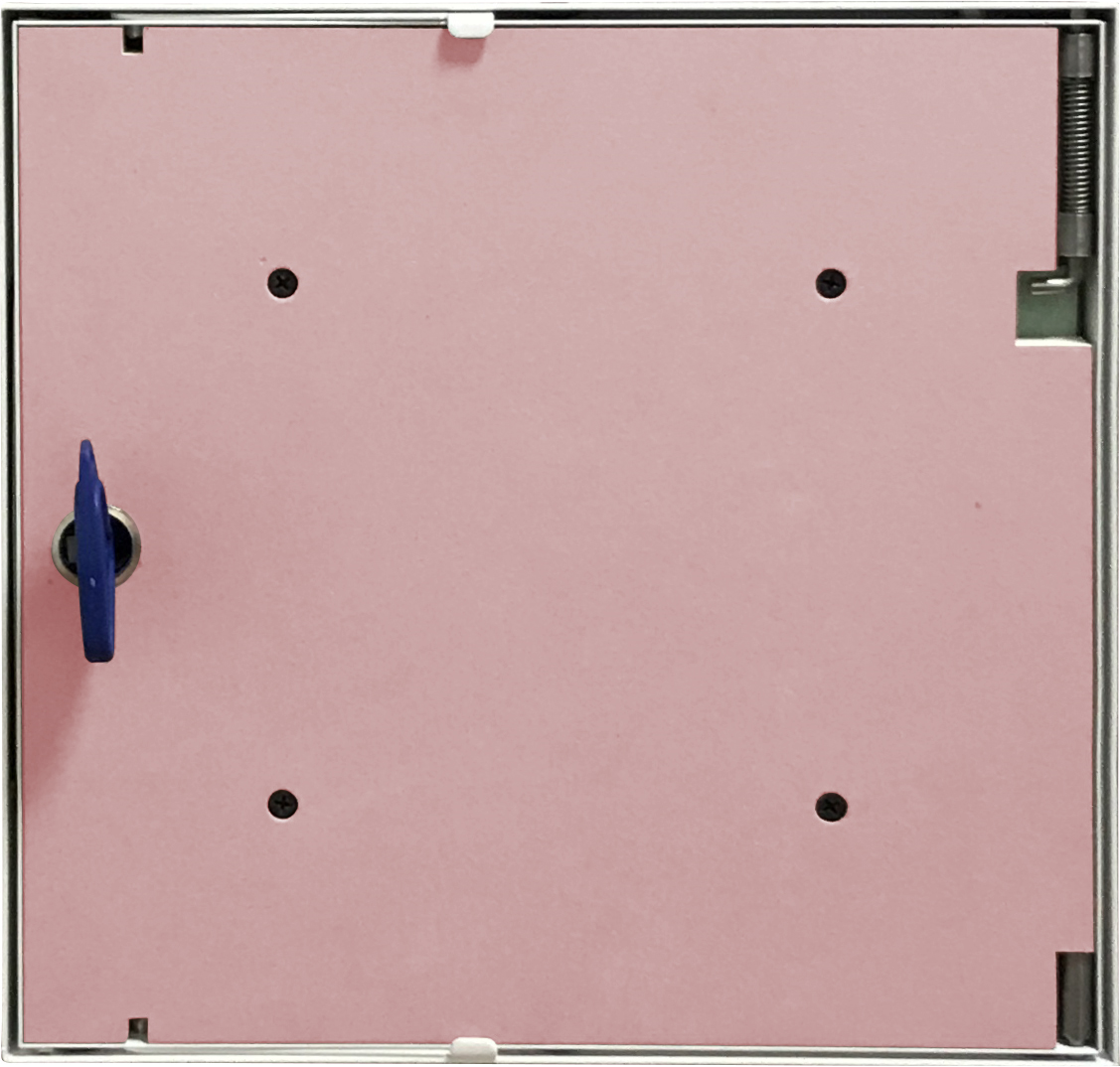 Revisionsklappe UniSpace 90 Minuten 300 x 300mm als konzipierter Revisionsöffnungsverschluss in den Konstruktionen Installationsschächte, Schachtsysteme, Vorsatzschalen und Unterdecken. Ab der Größe 600 x 800mm sind diese nur noch für den Wandeinbau zugelassen. Beim Einbau kann man noch die Anschlagseite bestimmen. Nach der Festlegung der gewünschten Anschlagseite wird alles verspachtelt, auch die im Bild 2 zu sehenden Schrauben und die beiden Öffnungen, sodass es eine glatte saubere Fläche ergibt.