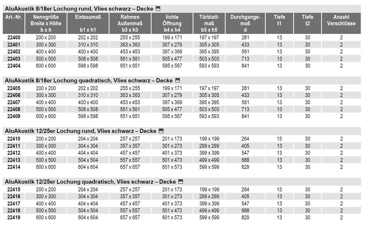 Revisionsklappe Alu-Akustik 400 x 400mm, Lochung 12/25 quadratisch, Vlies schwarz für den Einbau in Akustikdecken. Auf der Rückseite der Alu Akustik Revisionsklappe ist eine Vlies Kaschierung schwarz angebracht. Abgestimmt sind die Einbaumaße der Revisionsklappe auf die Lochplatten im Deckenbereich.