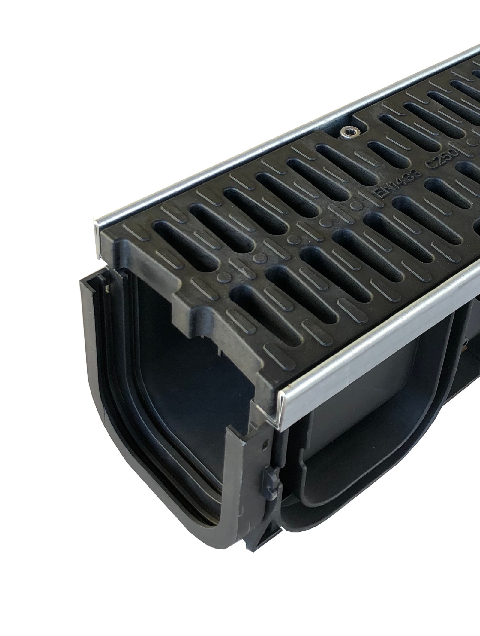 Entwässerungsrinne mit Stahlzarge und einem rostfreien Kunststoffrost in Gußdesign. Belastbarkeit Klasse C 250. Mit integrierter Stahlzarge gegen Schutz der Kanten.